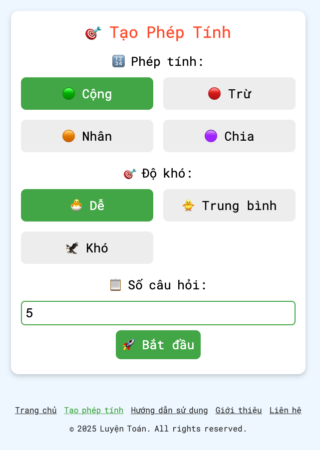 Sau khi thiết lập xong, Bé có thể nhấn nút "Bắt đầu" để nhận các phép tính ngẫu nhiên và luyện tập.