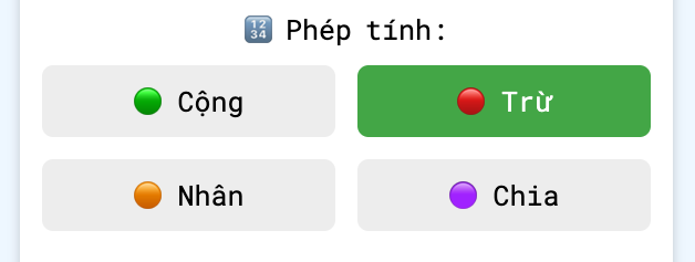 chọn loại phép tính mà Bé muốn luyện tập: Cộng, Trừ, Nhân hoặc Chia, khi chọn menu sẽ có màu xanh