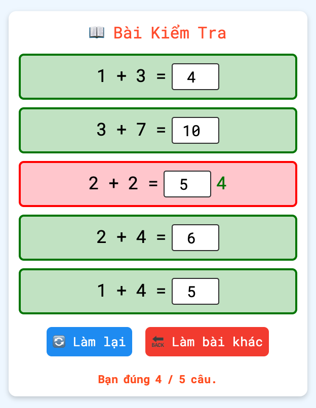 Từ màn hình này Bé có thể lựa chọn làm lại bài kiểm tra bằng cách chọn vào [Làm Lại] hoặc làm bài mới bằng cách chọn vào [Làm Bài Khác].