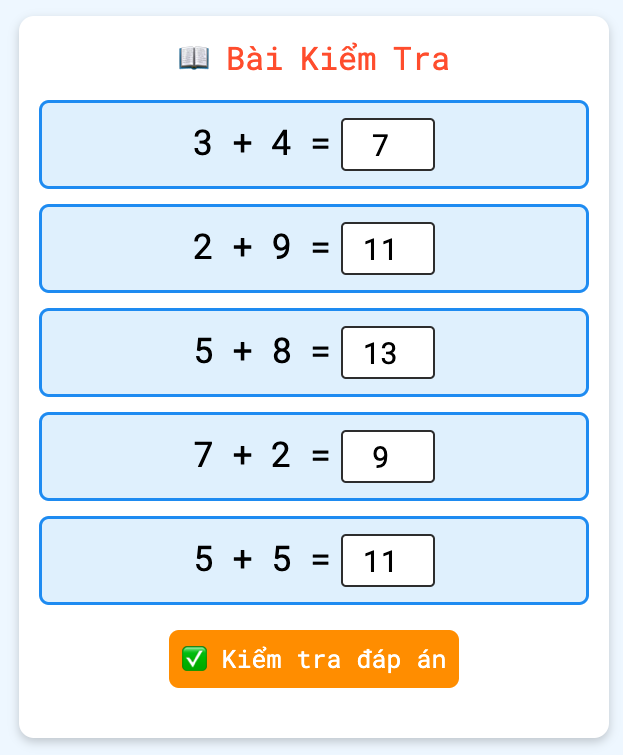 Sau khi thiết lập xong, Bé có thể nhấn nút "Bắt đầu" để nhận các phép tính ngẫu nhiên và luyện tập.