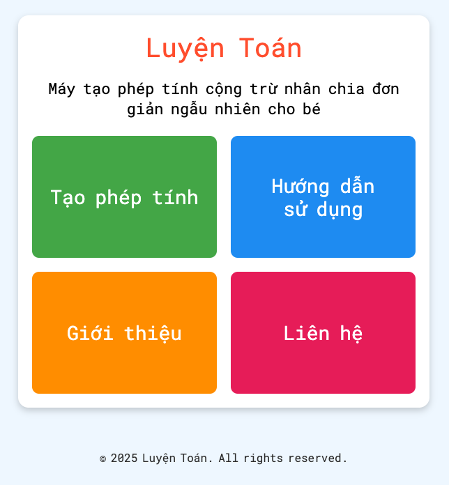 Trang web Luyện Toán được thiết kế để giúp các em học sinh tiểu học rèn luyện kỹ năng toán học một cách hiệu quả. Dưới đây là hướng dẫn sử dụng: